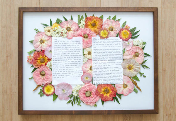 We offer personalizations such as adding vows or wedding invitations in the frame to have a way to cherish momentos of a wedding along with all of the sentimental blooms.