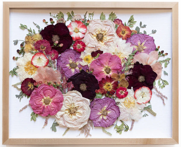 Celebration already passed or flowers turning brown? Although we cherish designing with the real blooms from celebrations, Pressed Floral offers a recreation option made with reordered flowers. Send us a picture of the bouquet or an ingredient list and we will give you a quote today!