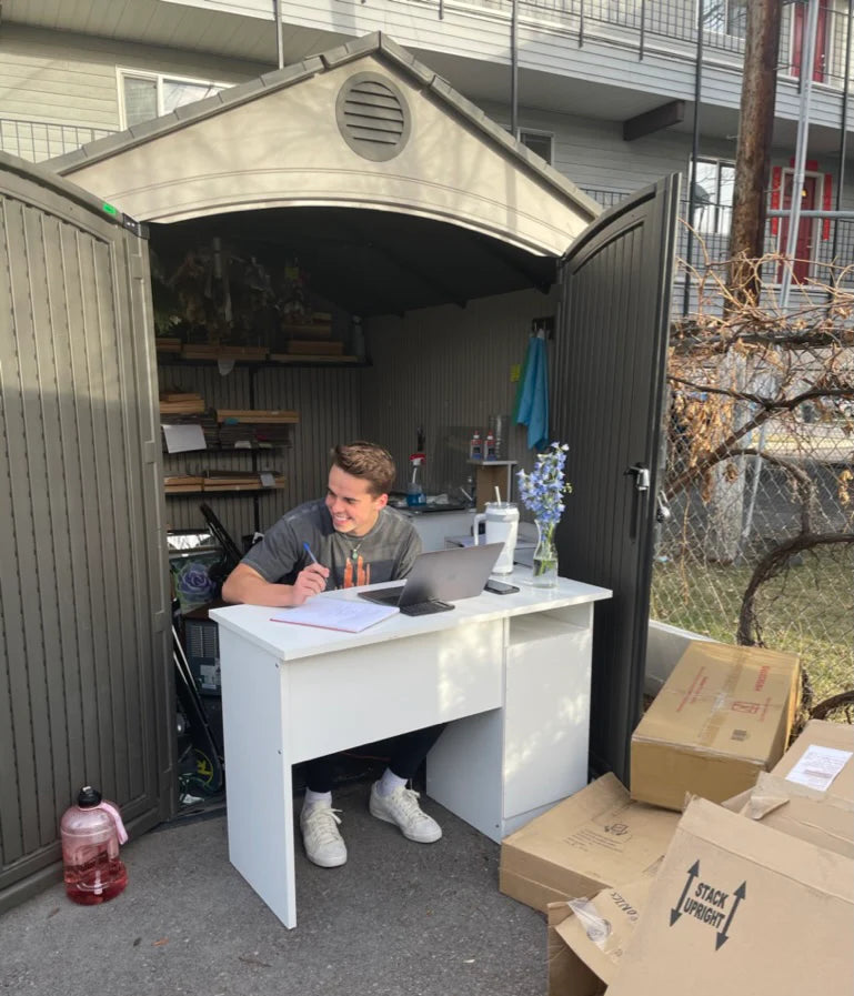 In 2019, with help from family and friends, Sarah had a lifetime shed built and placed it in her college dorm parking spot with an extension cord running all the way to her room. Sarah remembers: